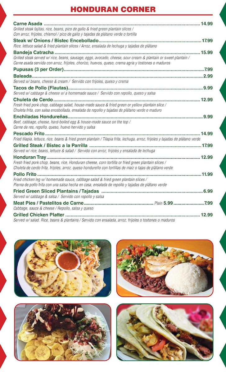Fresh fried pork chop, beans, rice, Honduran cheese, corn tortilla or fried green plantain slices. chuleta de cerdo frita, frijoles, arroz, queso hondureño con tortillas de maiz o tajas de platano verde.