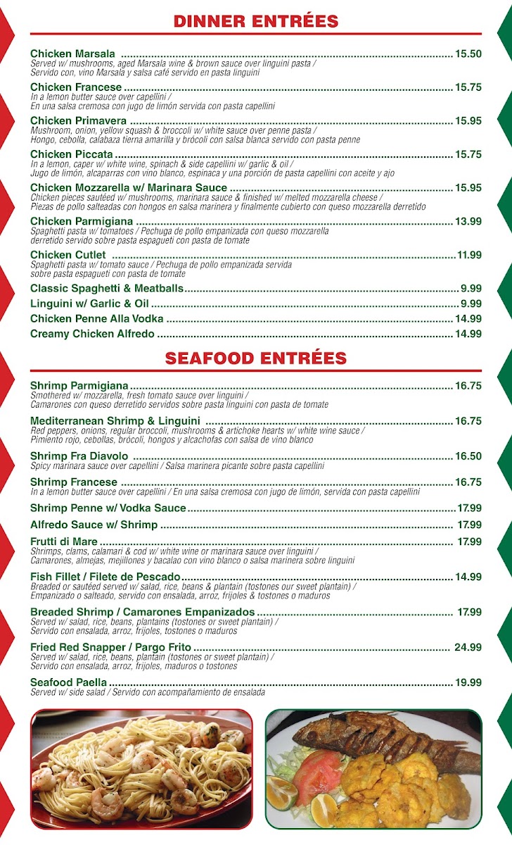 Shrimps, clams, calamari and cod with white wine or marinara sauce over linguini. Camarones, almejas, mejillones y bacalao con vino blanco o salsa marinera sobre linguini.